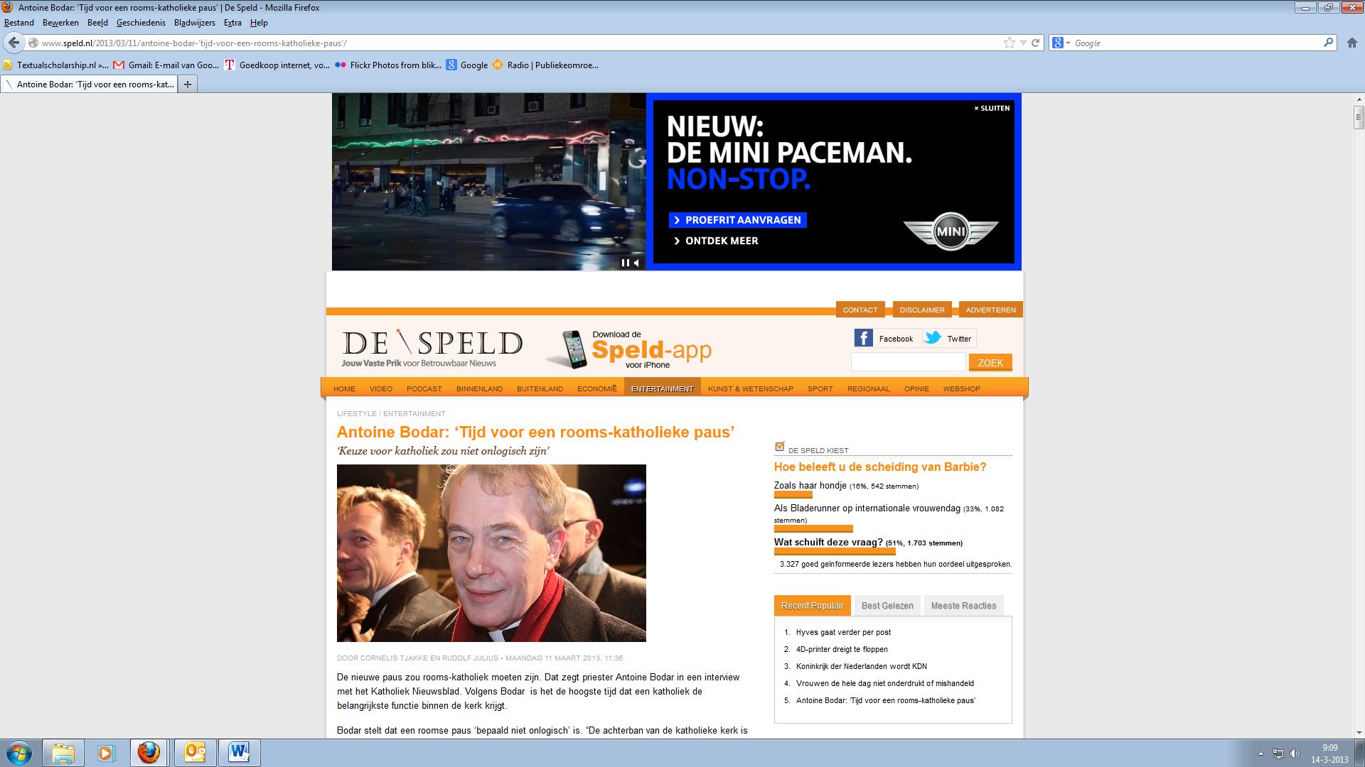 Benedictus de Zestiende had net laten weten dat hij met vervroegd pensioen ging of er ging al een grap rond. Er was zogenaamd een kop met een spatiefout in een krant verschenen: ‘Paus op non actief’. Flauw. Een paar weken later, terwijl kardinalen uit de hele wereld in Rome arriveerden en een paar van hen al stiekem de maat lieten nemen voor een nieuwe jurk, liet The Daily Show van Jon Stewart zien dat ook Amerikanen leuke grappen over pausen en seks kunt maken.