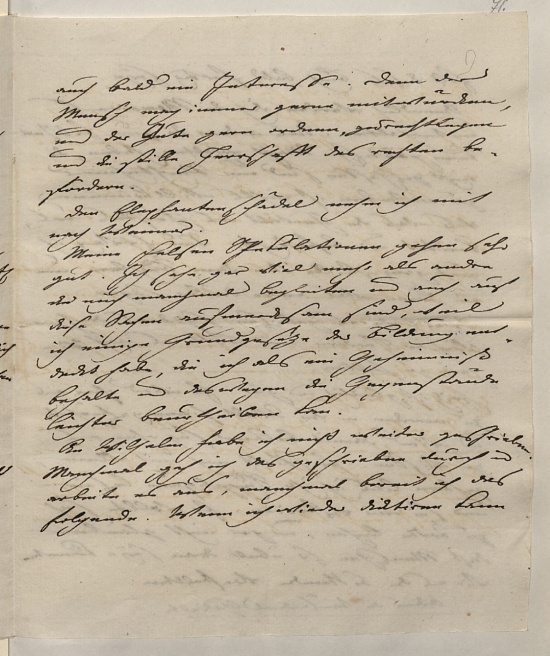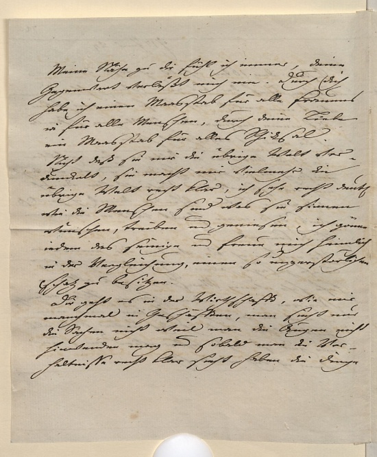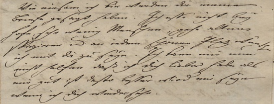 Ich esse nicht bey Hofe, sehe wenig Menschen, gehe allein spazieren und an iedem schönen Plaz wünsche ich mit dir zu seyn. Ich kann mir nun nicht helfen daß ich dich lieber habe als mir gut ist desto besser wird mir seyn wenn ich dich wiedersehe.