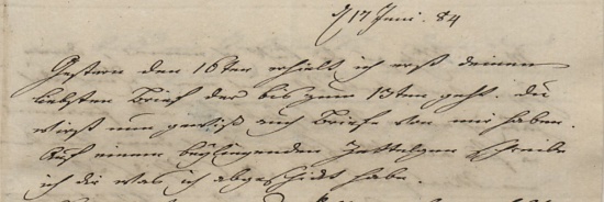 We komen terecht op een site van de Klassik Stiftung Weimar, die onder andere de archieven van Goethe en diens kompaan Friedrich von Schiller beheert. We zien nog niet de beloofde brieven van Goethe aan Von Stein, maar wel een repertorium van alle brieven van Goethe. We moeten eerst naar de lijst met geadresseerden, daar naar de S en dan weer naar de St, en dan zijn we bij de achternamen die met St beginnen, dus ook bij Charlotte von Stein. Dat wil zeggen: we zijn bij de 1770 afzonderlijke links naar Goethe’s brieven aan Charlotte. En wat zit er achter zo’n link? Laten we de brief van 17 juni 1784 nemen. We zien ten eerste dit: