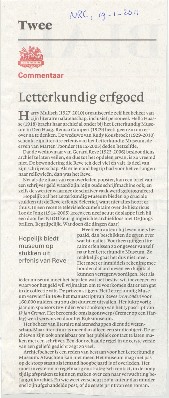 Hoofdredactioneel commentaar in de NRC van 19 januari over ‘Letterkundig erfgoed’. Aanleiding: de aangekondigde Grote Gerard Reve-Veiling.